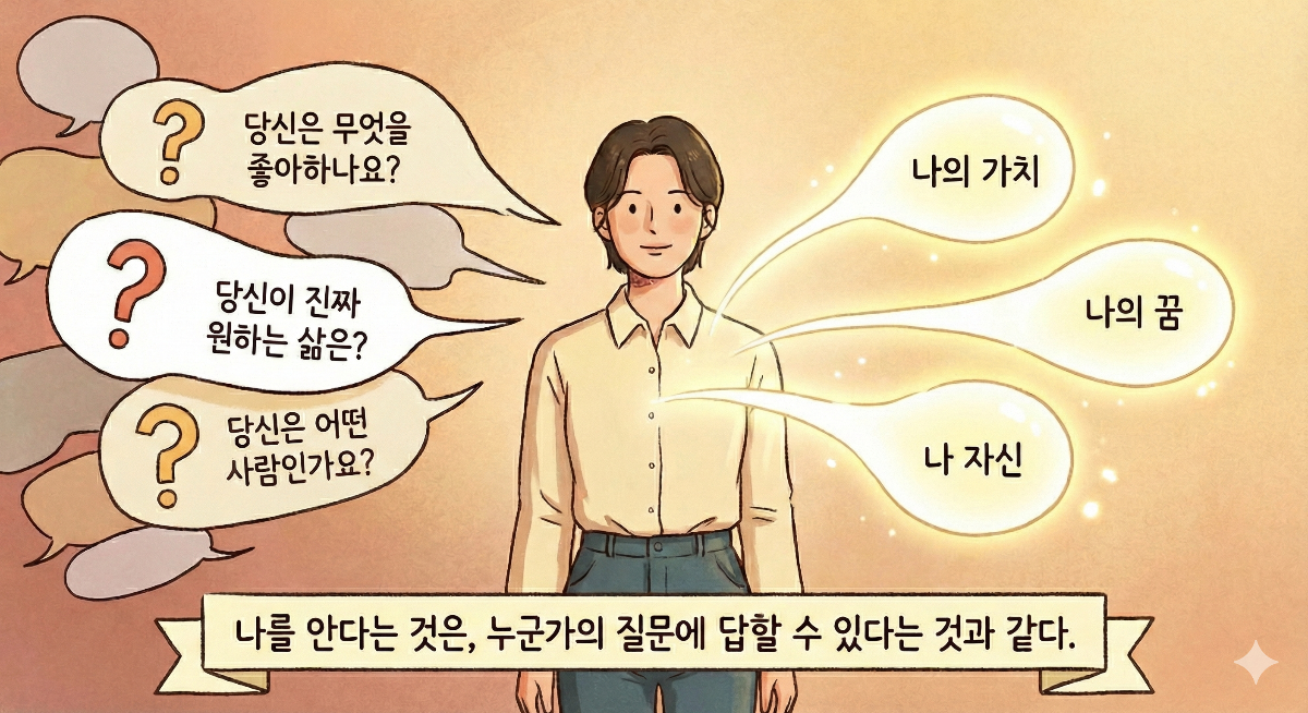 철학책을 읽거나 명상을 수백 시간 해야 알 수 있는 것이 아닙니다. 아주 단순한 질문에 망설임 없이 대답할 수 있는 것, 그것이 바로 나를 아는 것입니다.