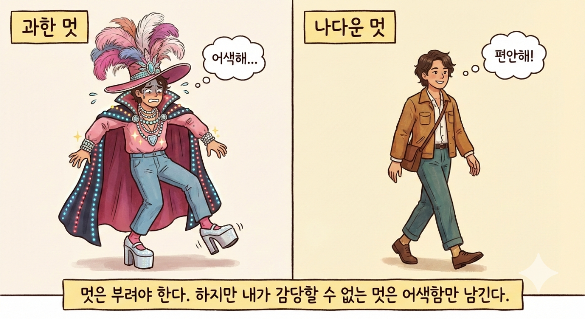 듣는 순간, 나를 표현하려던 마음이 주눅 듭니다. 하지만 이 말은 반만 맞습니다. 멋을 부리지 말라는 것이 아니라, 내가 감당할 수 없는 멋을 부리지 말라는 뜻입니다.