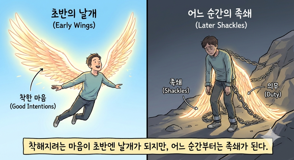 착함은 목표가 아닙니다. 착함은 내가 누구인지 안 다음에 선택하는 태도입니다. 초반에는 착해 보이는 것이 성장처럼 느껴질 수 있습니다. 하지만 나를 숨긴 채 착한 척하는 것은, 언젠가 나를 찾아가는 과정에서 발목을 잡게 됩니다.