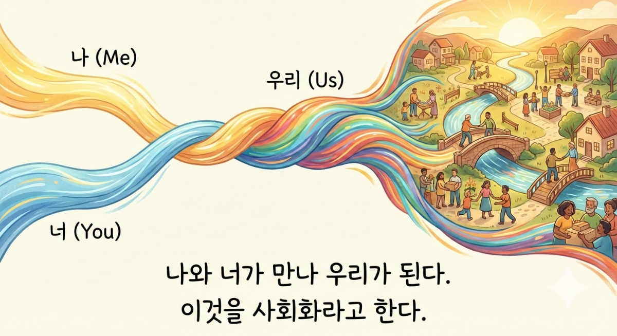 사회화는 나를 포기하는 것이 아닙니다. 나와 너가 만나 서로를 조금씩 바꾸는 과정입니다. 나는 조금 유연해지고, 너는 조금 이해받습니다. 그 과정에서 ‘우리’라는 새로운 관계가 시작됩니다. 나를 지키면서 동시에 관계를 만드는 것, 그것이 진짜 사회화입니다.