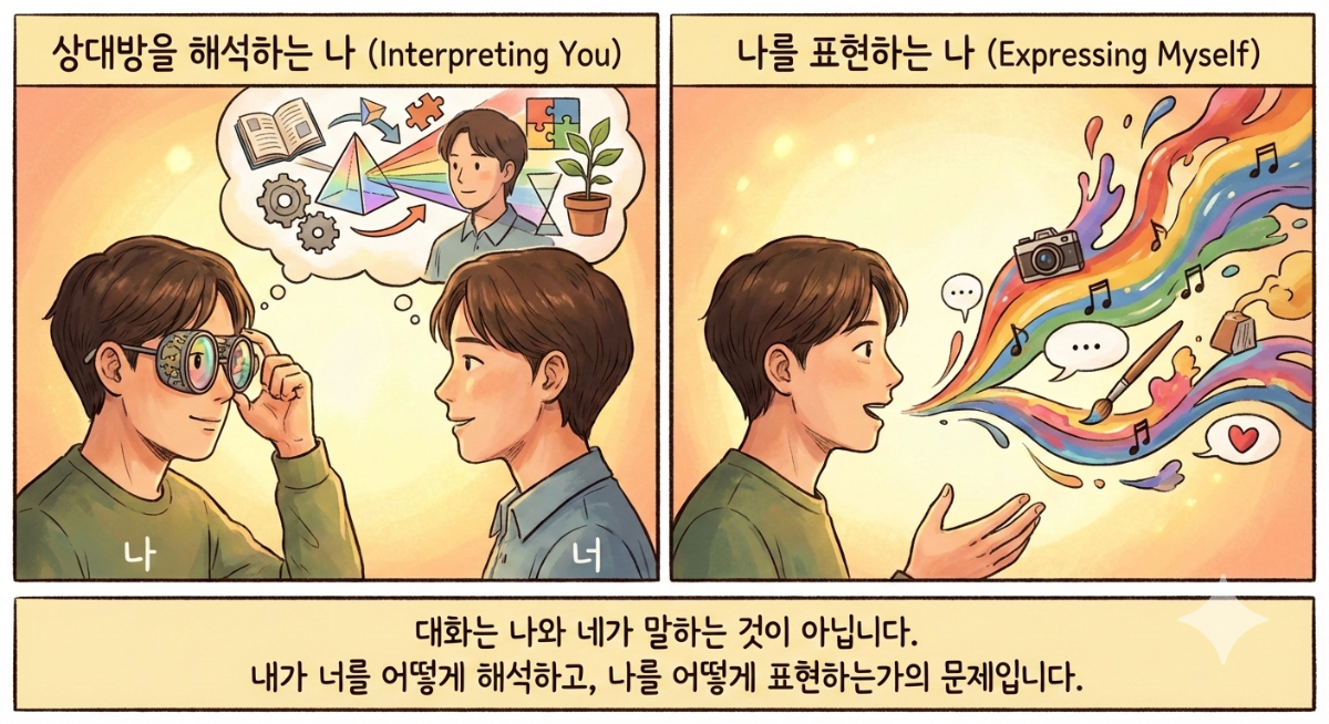 대화는 정보의 교환이 아닙니다. 너에 대한 정보를 내가 해석하는 것과, 나에 대한 정보를 내가 표현하는 것이 만나는 자리입니다. 그 중심에는 언제나 ‘나’가 있습니다. 이것을 이해할 때, 우리는 비로소 오해를 탓하지 않고 해석을 돌아보게 됩니다. 상대를 바꾸려 하기 전에, 내가 어떻게 해석하고 있는지를 먼저 살피는 것. 그것이 진짜 대화의 시작입니다.