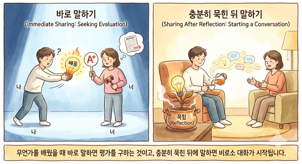 말하고 싶은 충동이 생겼을 때, 한 번만 물어보십시오. “나는 지금 확인받고 싶은 건가, 아니면 나누고 싶은 건가.” 얻은 직후 바로 상대에게 향하는 말은 평가를 부르고, 나에게 먼저 돌아오는 말은 대화를 만듭니다. 그리고 그것이 충분히 익었는지는 머리가 아니라 몸이 먼저 압니다. 더 이상 혼자 담고 있을 수 없다는 그 감각, 그것이 진짜 대화의 시작입니다.
