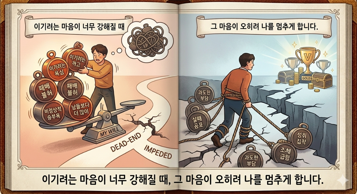틀린 말은 아닙니다. 하지만 그 말이 언제부터인가 나를 앞으로 나아가게 하는 것이 아니라, 움직이지 못하게 만들고 있다면 어떨까요. "이길 때까지"라는 생각이 동력이 아니라 족쇄가 되는 순간이 있습니다.