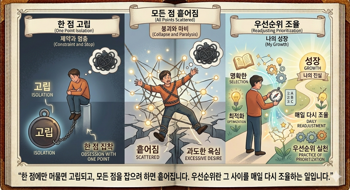 “한 점에만 머물면 고립되고, 모든 점을 잡으려 하면 흩어집니다. 우선순위란 그 사이를 매일 다시 조율하는 일입니다.”