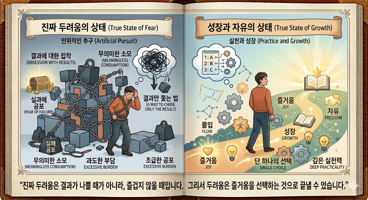 결과가 나오지 않는 것은 견딜 수 있습니다. 하지만 즐겁지 않은 것은 오래 견디면 안 됩니다. 즐거움이 사라지는 신호를 가장 먼저 알아채는 사람이, 가장 오래 성장할 수 있습니다. 그리고 그 신호가 들릴 때, 두려워하는 대신 다른 즐거움을 선택하십시오. 즐거움은 보상이 아니라 연료입니다. 지금 당신이 느끼는 그 두려움은, 더 잘 맞는 길을 찾으라는 신호입니다.