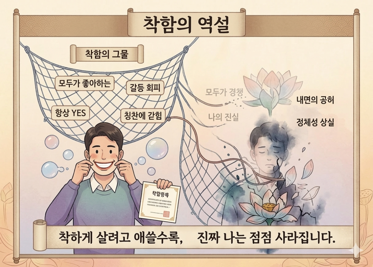 착한 사람이라는 평가를 유지하기 위해 하고 싶은 말을 삼킵니다. 하기 싫은 일을 웃으면서 맡습니다. 억울해도 먼저 사과합니다. 그것은 착함이 아니라, 착하다는 이미지에 내가 갇혀버린 것입니다.