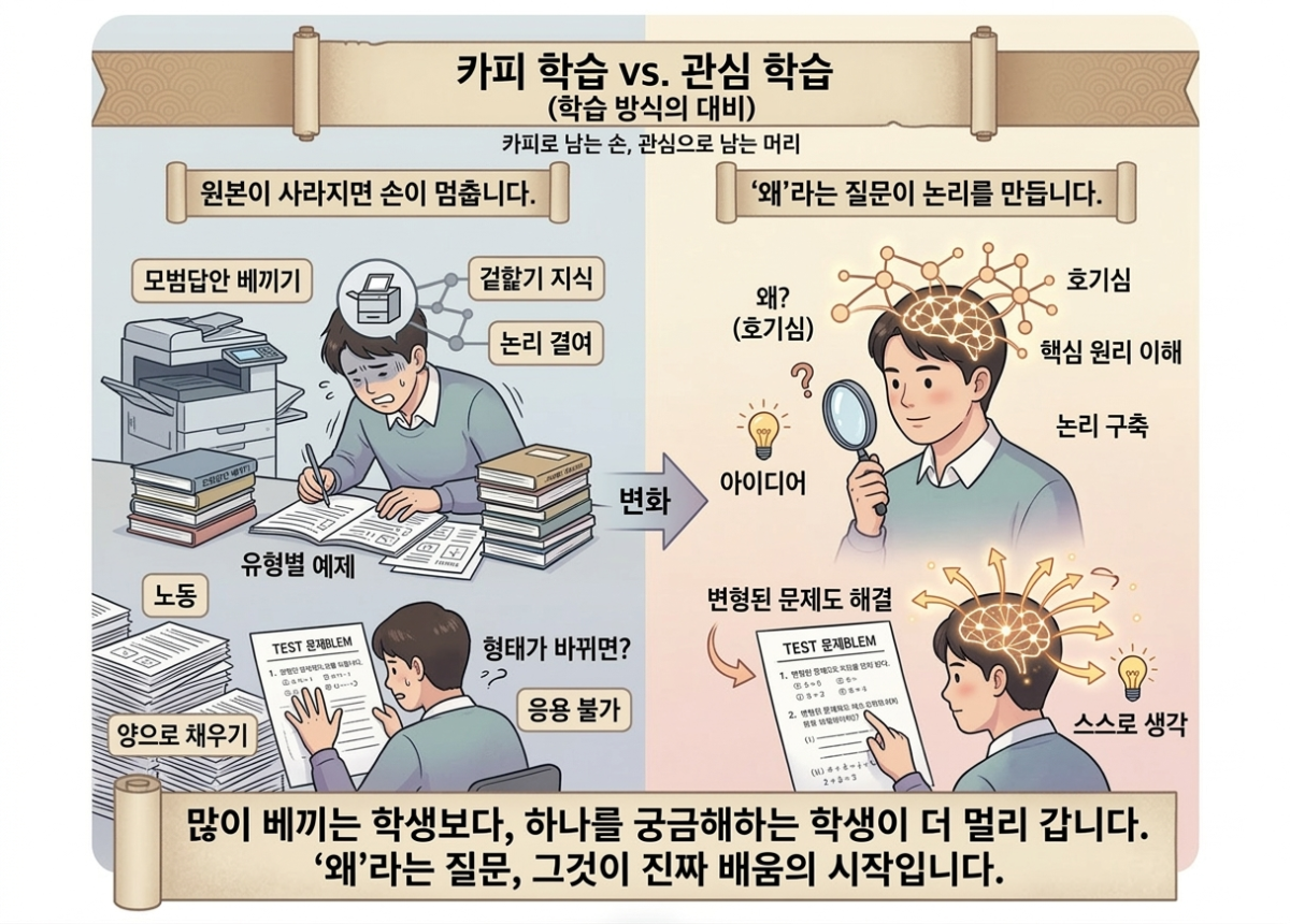 카피 학습의 가장 큰 문제는 논리적 연결이 끊겨 있다는 것입니다. 이 단계에서 저 단계로 넘어가는 이유를 모른 채, 순서만 외웁니다.
