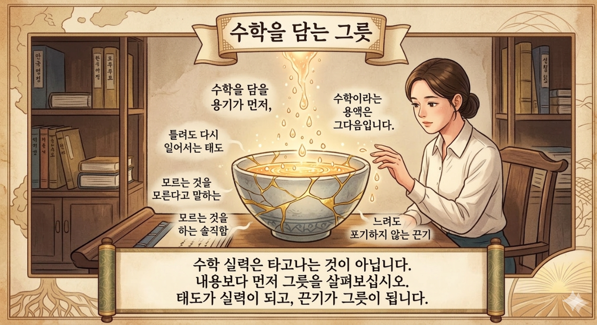수학을 잘하는 것은 많이 아는 것이 아닙니다. 담을 수 있는 사람이 되는 것입니다. 태도가 실력이 되고, 끈기가 그릇이 됩니다. 용기가 깊어질수록 담을 수 있는 수학의 양도 많아집니다. 지금 성적이 오르지 않는다면, 내용보다 먼저 그릇을 살펴보십시오.