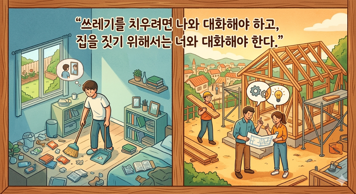 마음의 쓰레기는 부끄러운 것이 아닙니다. 살아있다는 증거입니다. 다만, 쌓인 채로 두면 방은 점점 좁아집니다. 나와 대화하며 하나씩 치워가는 것. 그리고 너와 대화하며 그 공간에 온기를 채워가는 것. 그것이 내 집을 만드는 일입니다.