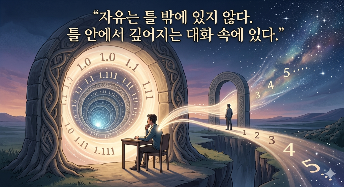 자유는 틀을 부수는 것이 아닙니다. 나와의 대화로 틀 안의 무한을 발견하고, 너와의 대화로 틀 너머의 무한을 만나는 것입니다. 삶이라는 틀은 감옥이 아닙니다. 두 방향의 무한이 시작되는 출발점입니다.