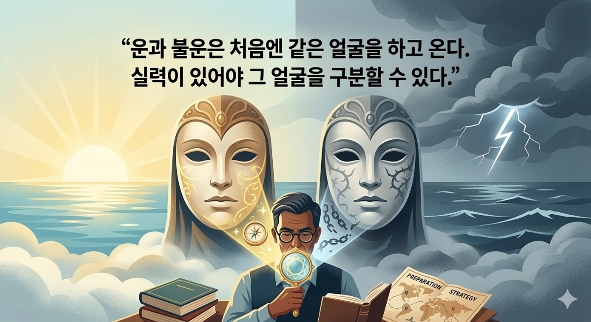 운과 불운은 처음엔 같은 얼굴로 옵니다. 실력이 있는 사람은 그것을 이용해 나아가고, 실력이 없는 사람은 그것 안에 갇힙니다. 지나고 나서야 그것이 무엇이었는지를 알게 됩니다. 그렇기에 지금 이 순간, 운을 탓하거나 기다리는 대신 실력을 쌓는 것이 가장 정직한 준비입니다.