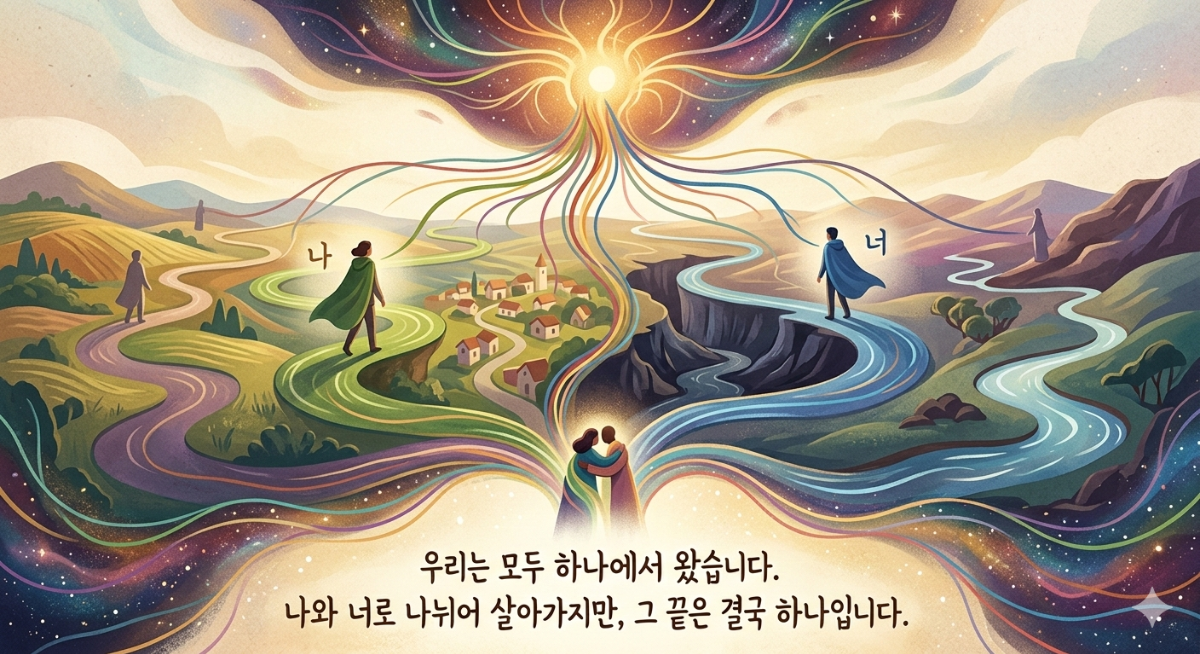 “우리는 모두 하나에서 왔습니다. 나와 너로 나뉘어 살아가지만, 그 끝은 결국 하나입니다.”